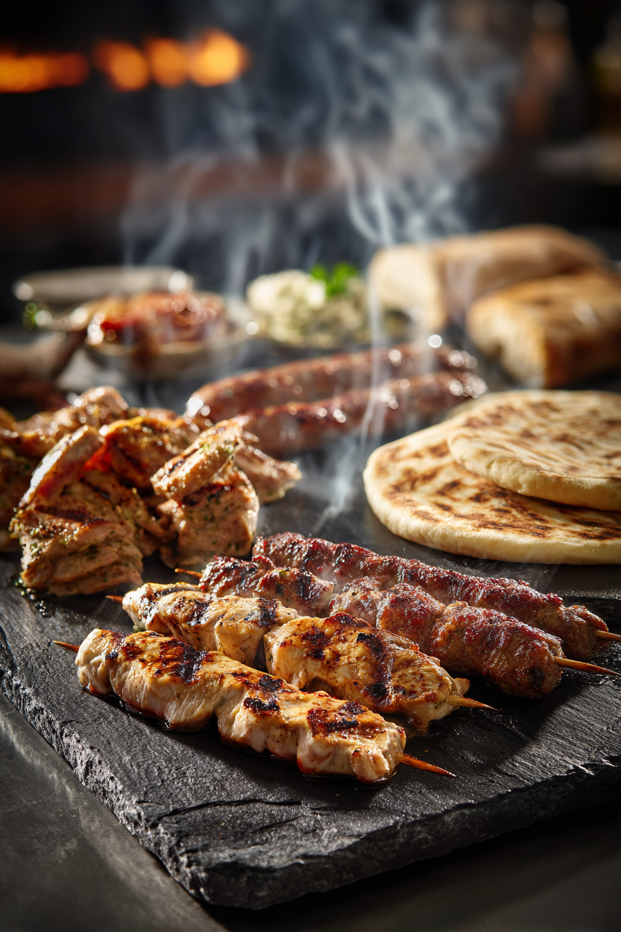 • Marinated kontosouvli, kebabs, sausages, and burgers