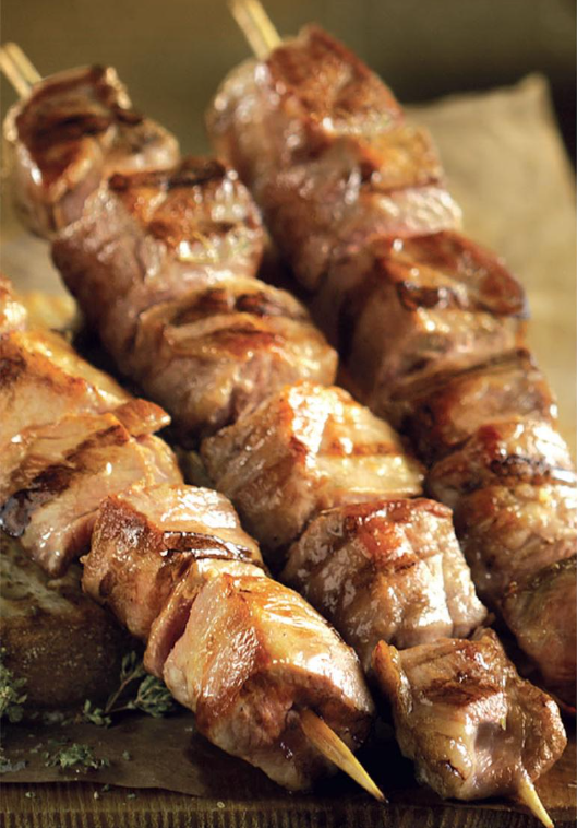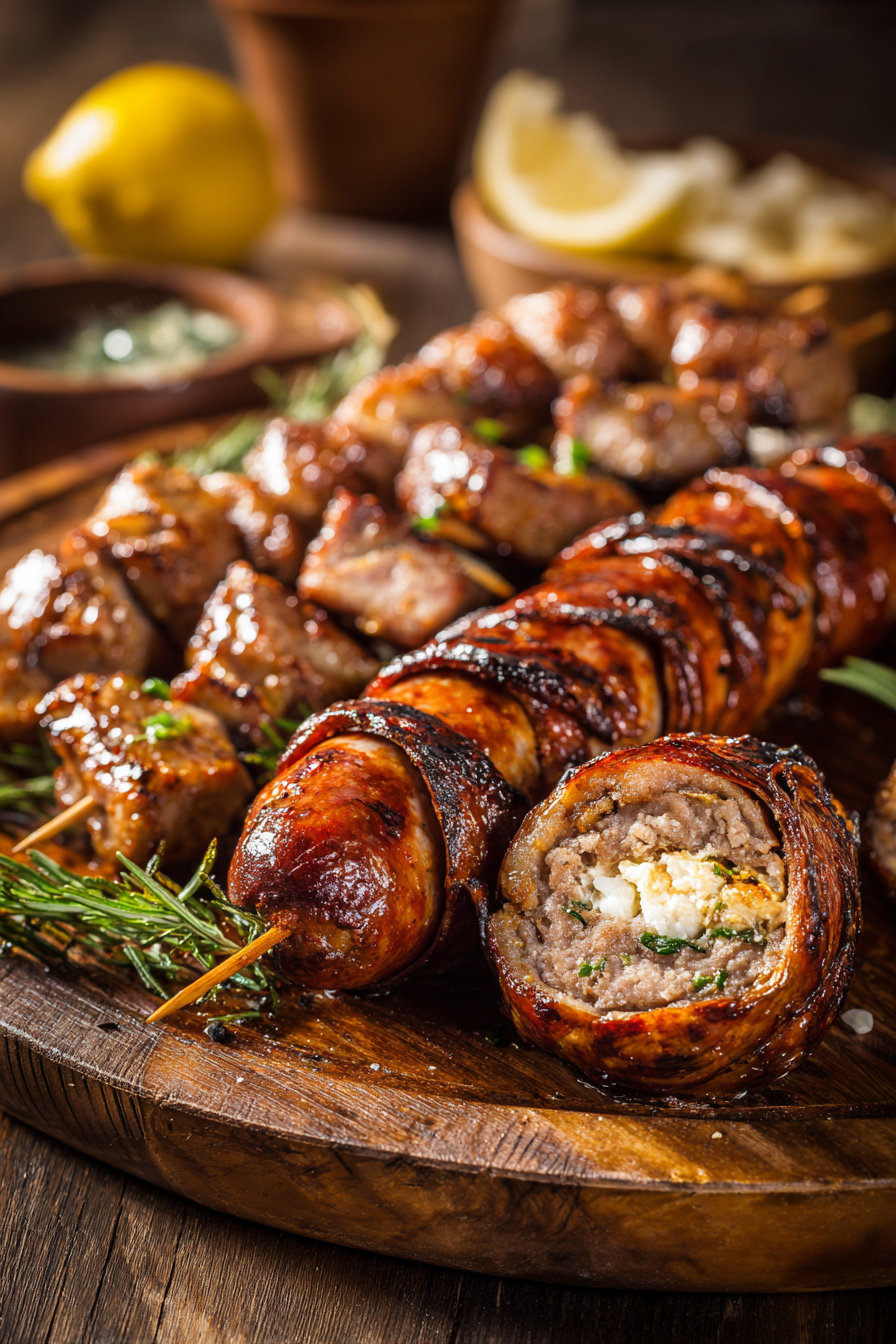 Traditional Greek Kokoretsi, Sausages & Marinated Kontosouvli